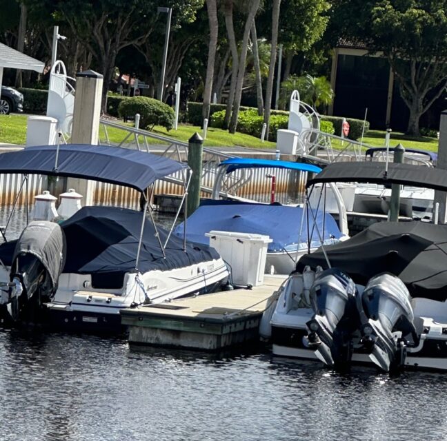 Several boats in the marina at The Landings sport Bimini covers. Halt: We’ve got you...