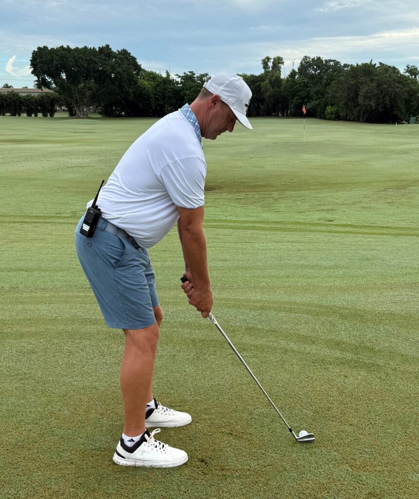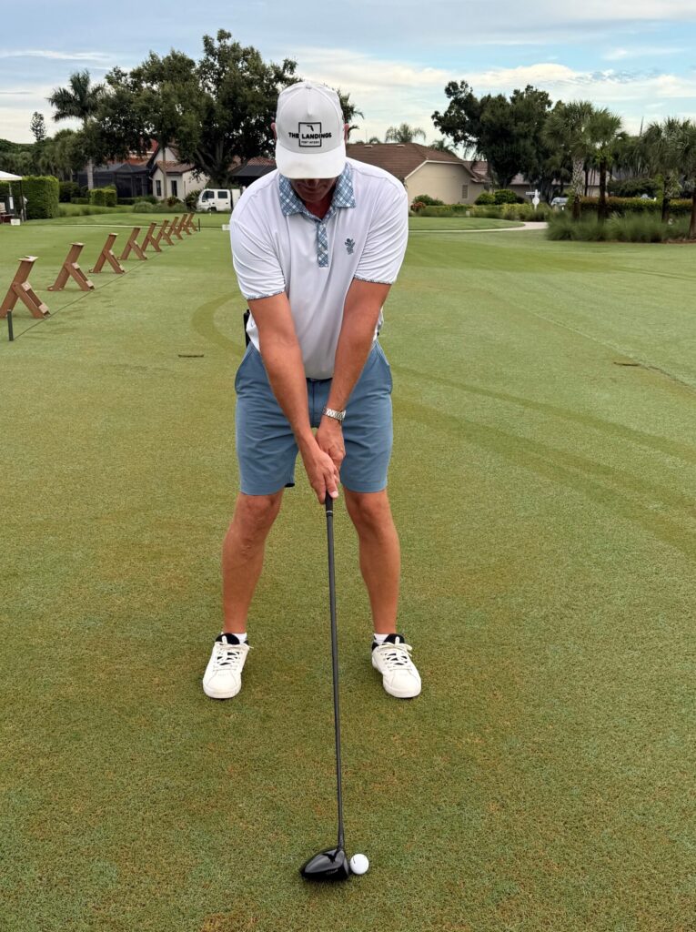 Great posture requires two things, Balance & Athleticism. Don’t over think it. Make your stance wide enough to stay balanced. Make sure your weight doesn’t favor your toes or your heels. Preferably, I like to feel like my weight rests in my arches. This feel, for me, keeps my weight towards the balls of my feet. Rule of thumb, the shorter the club the narrower your stance should be. The longer the club, the wider your stance will progress.