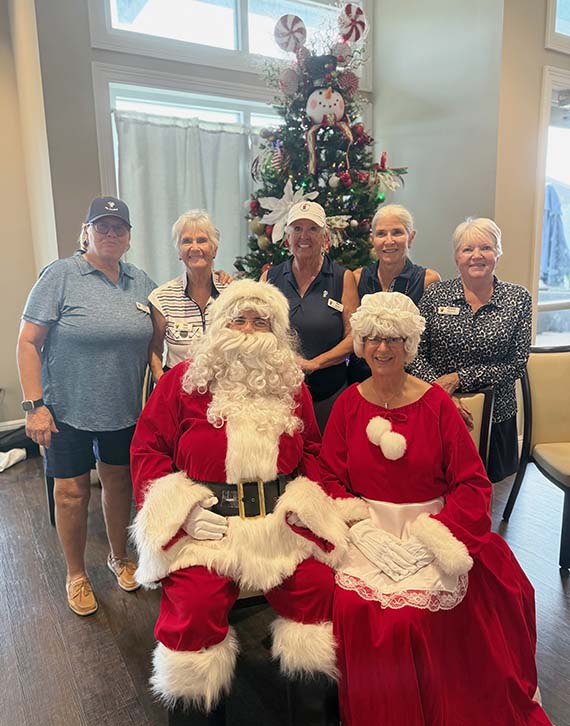 From left: Julie Iverson, Sue Lentz, Bev Reeves, Deborah Hedges and Ginny Minarchi with Santa and Mrs. Claus.