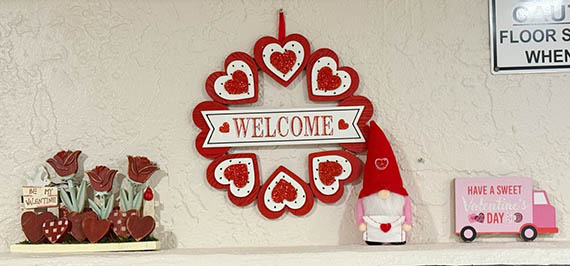 Did you know we have a decorating elf in 4616/4612? This sprite keeps the holiday or special occasion spirit visible by festooning our mailbox/elevator area with seasonal accoutrements. We thank our elf for providing a warm glow to our days.