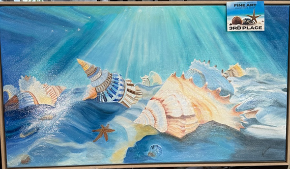 Happy congratulations to our talented resident, Gretchen Phillips, who won third place in the LYGTC Fine Arts contest with a focus on seashells. Gretchen captured in oil the motion and joy of shells lolling in the sea.