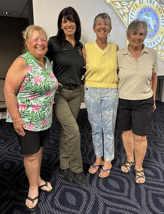 Don’t mess with us! Schooner residents Linda Tucker, Joan Vande Kieft and Jackie Wagner learned how to be formidable foes after participating in the safety seminar led by Crime Prevention Specialist Corinthia Losavro from the Lee County Sheriff’s Office. At The Landings women’s safety workshop around 20 women learned many ways to avoid becoming a victim, by using self-defense and escape techniques.