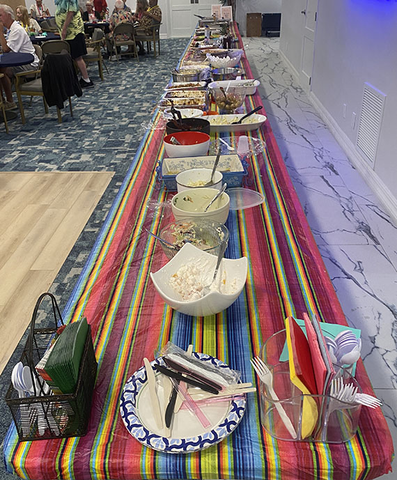 Ariel residents Rick Brown and Corston Lane coerced Keith Belfiglio to join them in providing entertainment for the evening. Their music was so good that the party went on much longer than expected, as people kept dancing while they played. That turned out to be fortuitous, since it helped everyone burn extra calories after enjoying this feast!