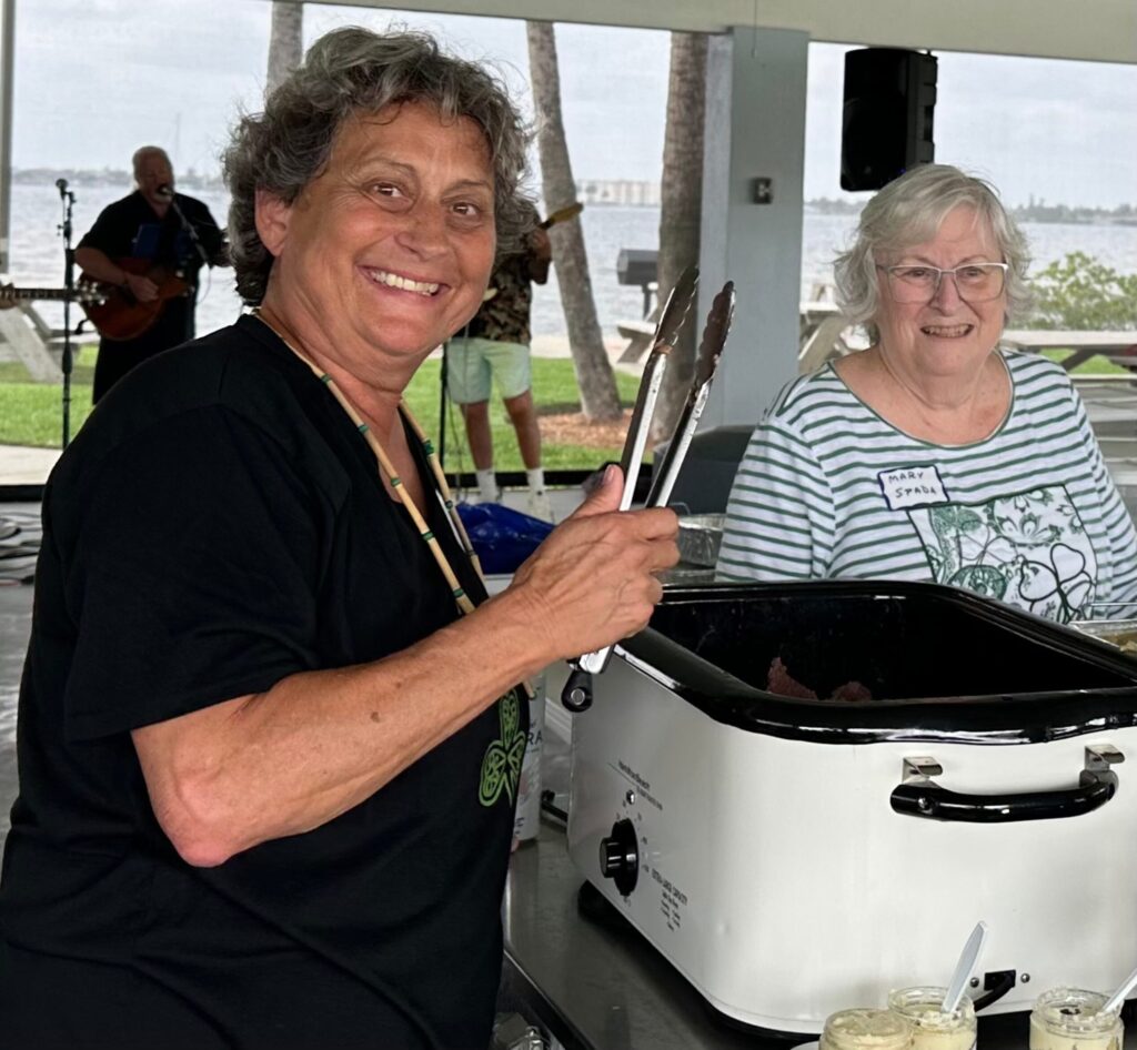 Since we were so close to St. Patrick’s Day, we chose corned beef and cabbage for everyone to enjoy. Mary Spada and I cooked 30 pounds of corned beef and ten heads of cabbage. Mary and Betty Kollar served the delicious dish to our guests.